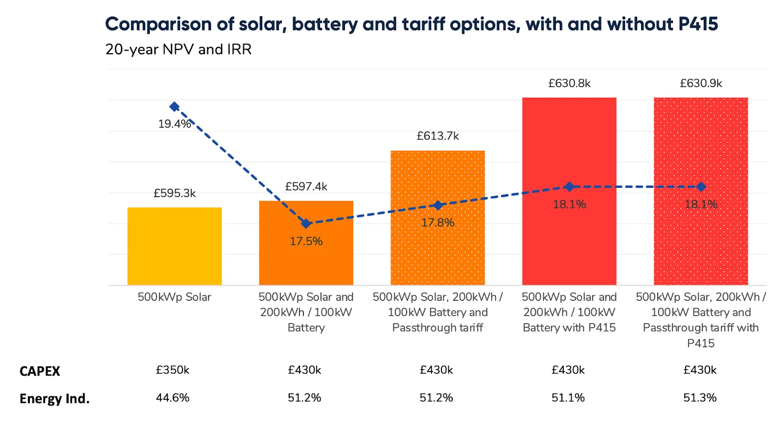 In the chart below, we can compare three different potential solar and battery solutions for the site. Comparing the first scenario, solar only, to the second, we can quickly see that simply adding a battery to the project (without considering tariff changes), provides only a slight improvement in the 20-year pre-tax NPV (with a 5% discount rate). But if we include a battery AND consider P415 in scenario 3, there is a much larger improvement on the overall value of the project.