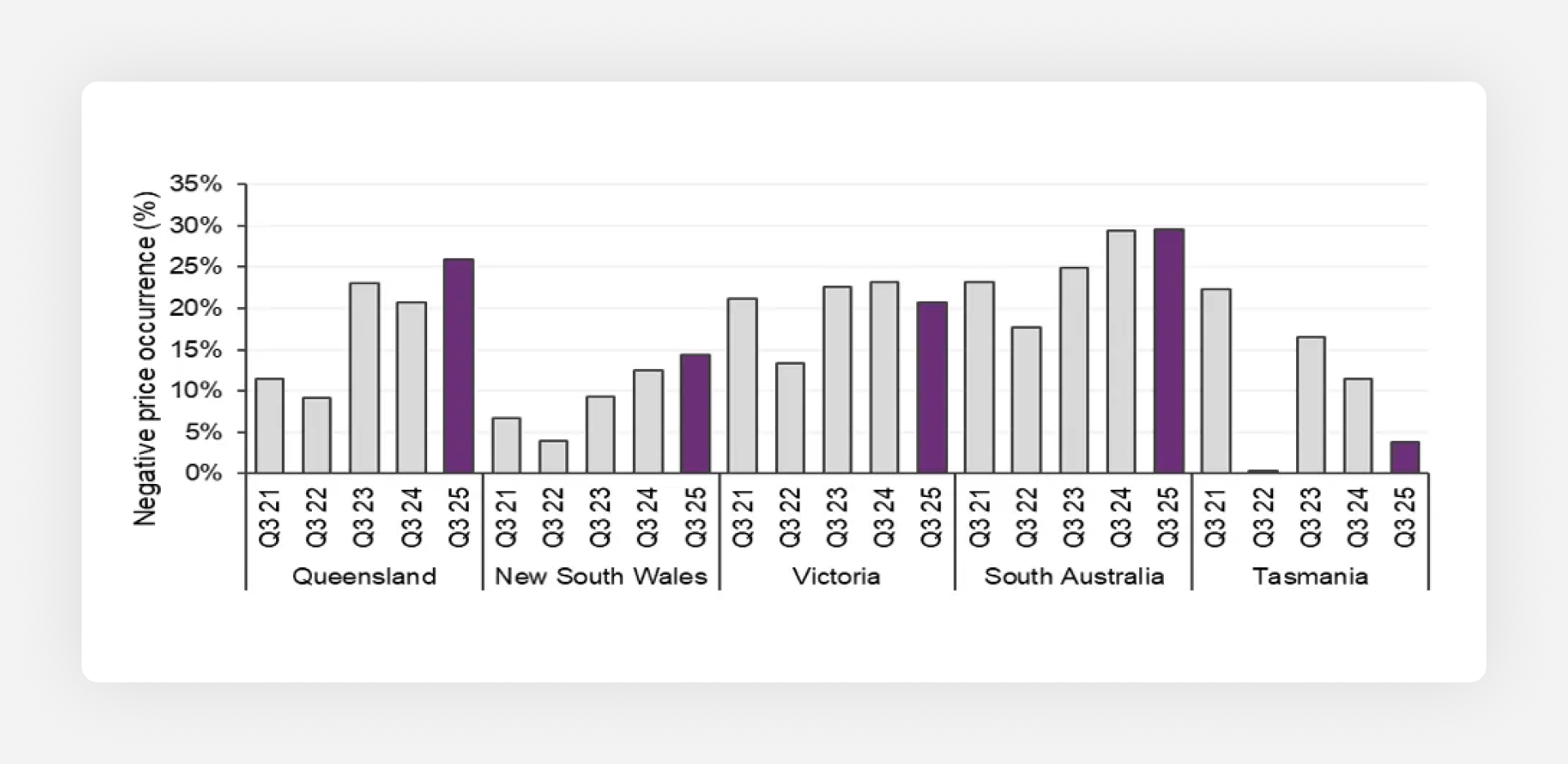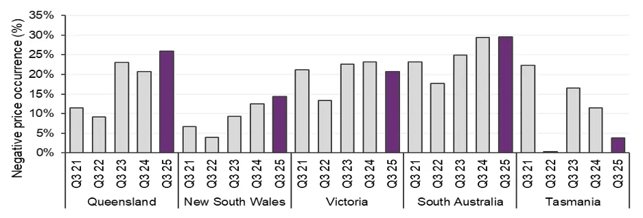 The frequency of negative energy prices has continued to grow. Negative prices are becoming more prevalent across all states except Tasmania (where Basslink transfer fee changes have shifted the marginal cost of energy). However, they are slowly edging their way closer to $0 with the average in Q3 of 2025 being -$16/MWh vs. -$33/MWh the year prior. A major cause of this is the falling value of LGCs as renewable supply skyrockets.