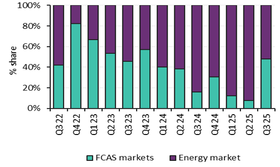 Batteries now dominate FCAS provision, consistently capturing 55 - 60% of market share throughout 2024-2025. They've effectively displaced older coal and hydro generators from the frequency control market.