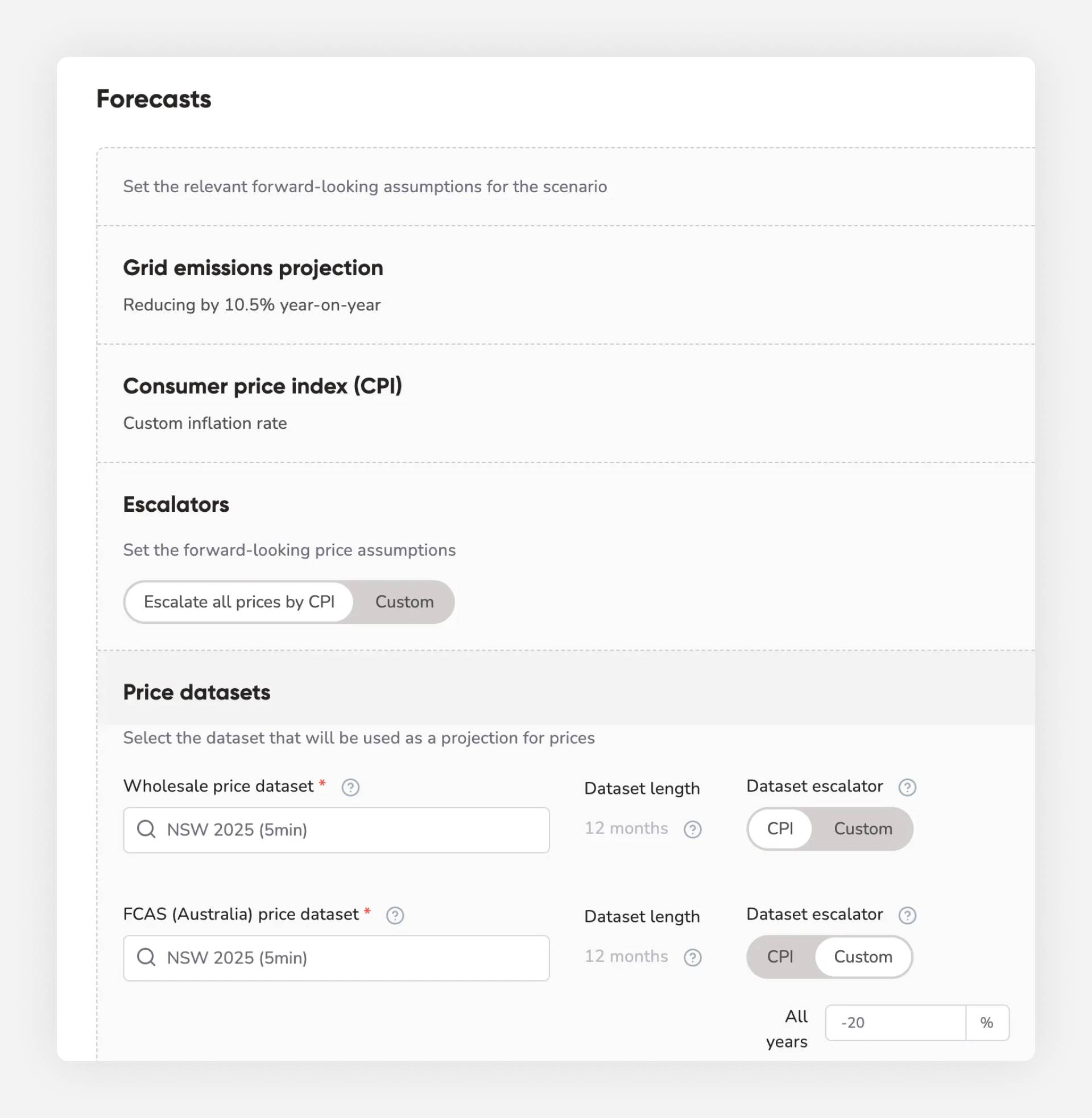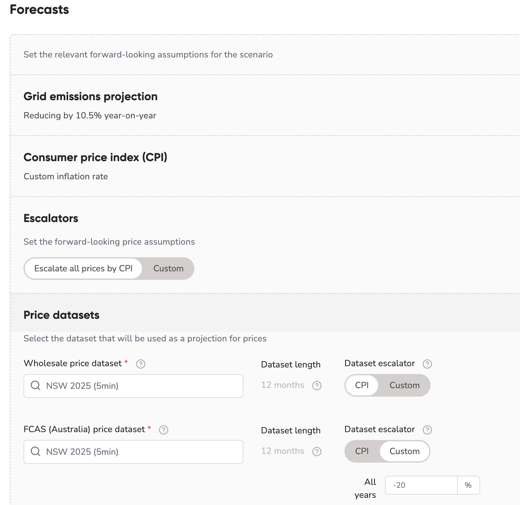 Carefully consider your chosen dataset and corresponding escalations - our recommended ‘default escalation’ currently follows the decline we’ve seen over recent years to FCAS growth. However, it is always best to speak to the party conducting any FCAS activity for your customers to decide what is appropriate here. Similarly on the wholesale dataset front, get your customers involved here to make sure your escalation estimates fit in with their business model, a simple CPI escalation is a relatively safe place to start.