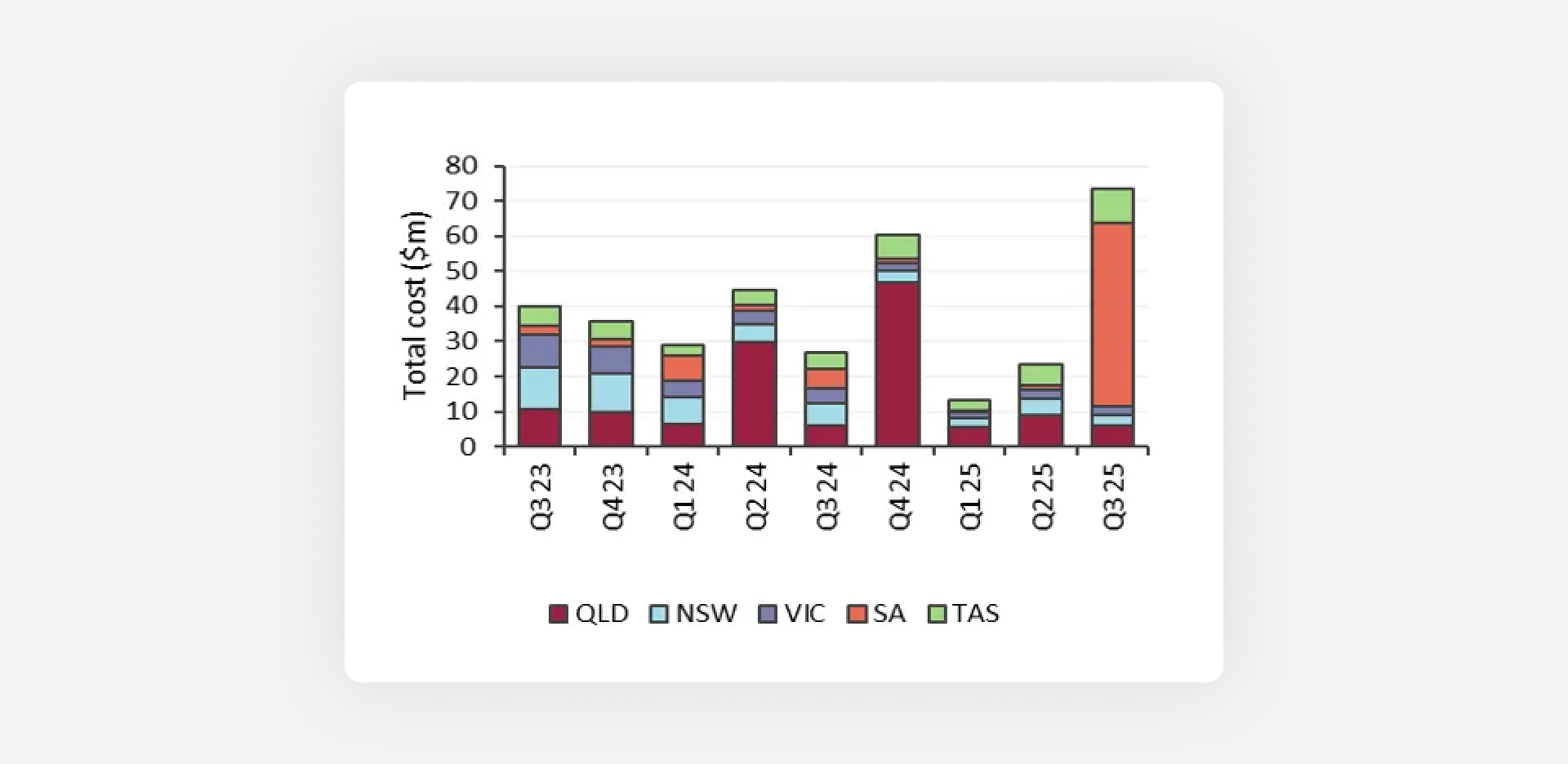Q3 saw a major shift as costs rose to $73 million, almost triple Q3 of the previous year. This was a result of planned maintenance restricting the Heywood interconnector, forcing AEMO to procure expensive local services within South Australia to manage islanding risk. This single event drove a $47 million cost increase, making up a large share of the total battery revenue.
