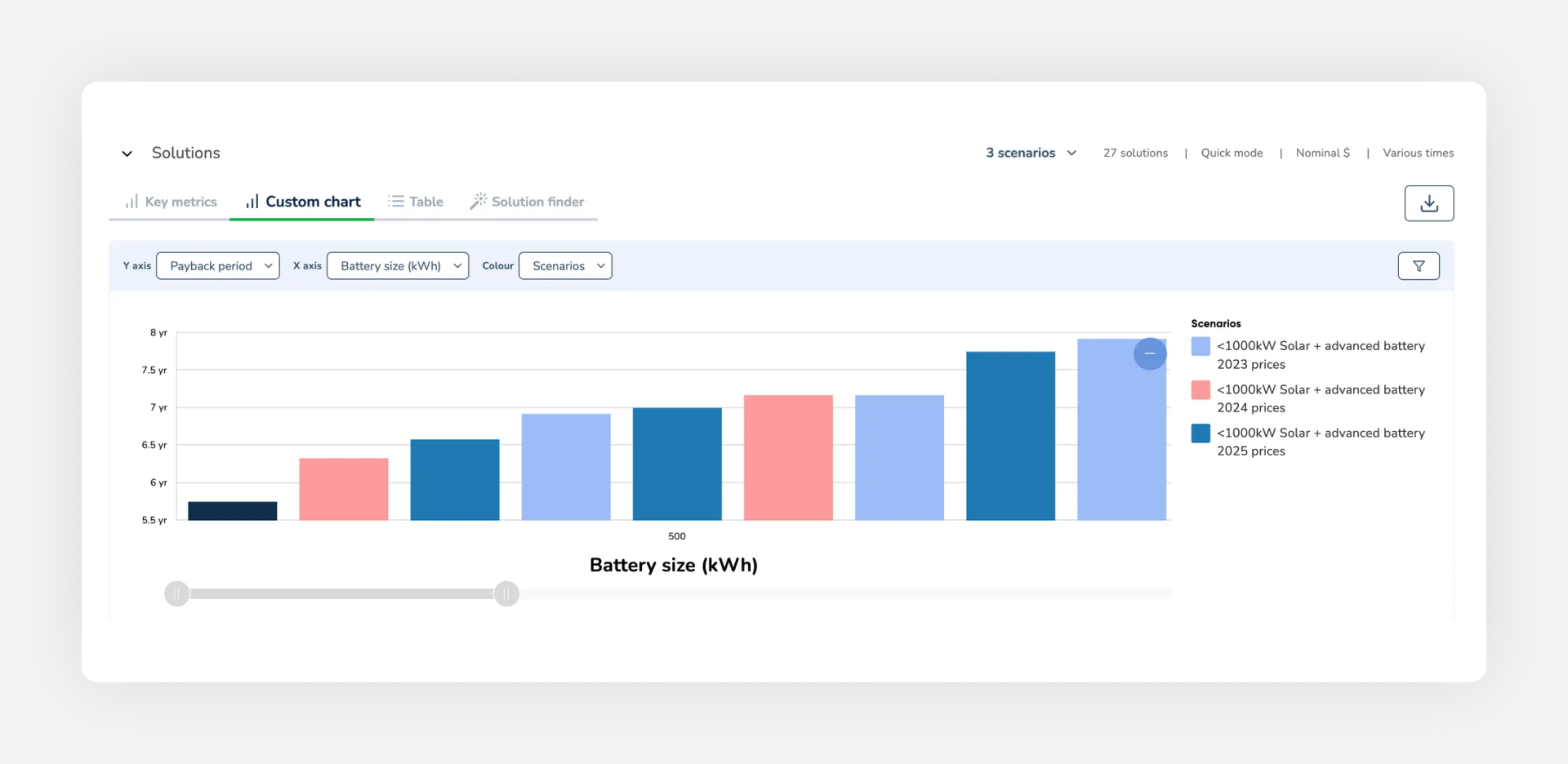 In this example, you can see that 2024 pricing delivers a slightly better payback than 2023. While the difference may seem small here, comparing 2023 to 2025 datasets shows a much larger disparity, underscoring why your price dataset choice matters.